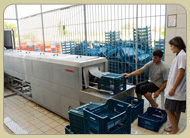 Otellerden geri dönüş yapan kasalar; Kasa yıkama makinesinde yıkanmaktadır. Kasa yıkama makinesi 2000 adet / saat yıkama kapasitesine sahip olup, kasalar burada dezenfekte edilip kullanıma hazır hale gelmektedir.